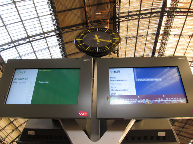 ↑列車案内板。液晶表示というハイテクさにびっくりしました。ある意味日本より進んでるかも。右側がこれから乗る列車。左側はカキで有名なリゾート地、アルカション行きのTER(急行)です。