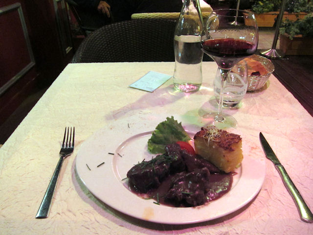 もう20時前になっていたので、まずはとにかく晩ご飯を食べなければということで、フロントに行きおすすめのレストランを聞きます。そこでお店を2軒教えてもらったのですが、ちょうど今は混み合う時間帯だから入れないかもしれないとのこと。とりあえずそのうちの1軒に行ってみたのですが、やはり一杯で断られてしまいました。そしてもう1軒の方もやはり一杯。中心部のレストランは外から見る限りどこも一杯のようで、まさかこんなにレストラン選びに困るとは思ってもみませんでした。街が小さい割に、観光客や時期的にぶどうの収穫を手伝いに来た人が多いのかもしれません。