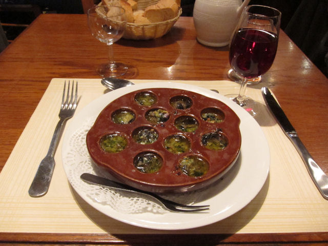↑まずは前菜のエスカルゴ。ブルゴーニュと言えばエスカルゴは外せません。味は薄めでしたが、やはりパンが良く進みます。ワインはメルキュレの赤を頂きましたが、ちょっと軽い感じでした。