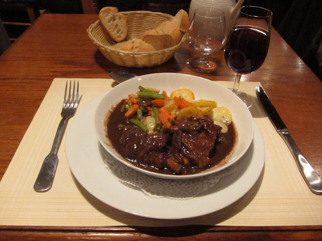 ↑メインディッシュはこれまたブルゴーニュ名物のCoq au vin(鶏の赤ワイン煮)。ほんとにブルゴーニュ風と付けばたいがい赤ワイン煮のような気がしますが、味は確かにおいしかったです。ワインはオート・コート・ド・ボーヌを頂きました。